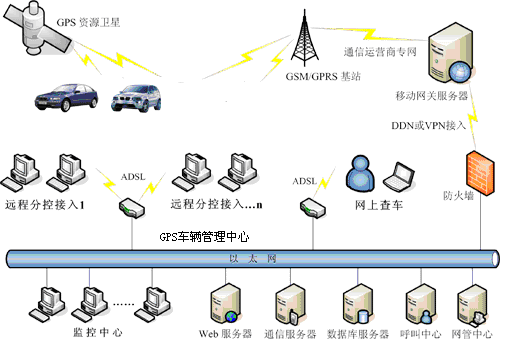 車輛車載終端通過主機(jī)內(nèi)的GPS芯片接收天空的GPS全球衛(wèi)星群的信號(hào),車載GPS終端將接收到的位置信息通過運(yùn)營商的網(wǎng)絡(luò)傳輸?shù)椒?wù)器中,并通過服務(wù)器中的軟件解析報(bào)文,然后顯示到客戶端的電腦中。從而實(shí)現(xiàn)對(duì)車輛的管理。