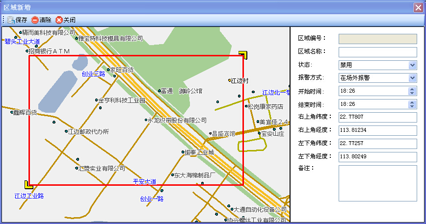 當(dāng)車輛行駛路徑超出監(jiān)控中心所設(shè)定的車輛行駛區(qū)域時,監(jiān)控平臺會報(bào)警顯示車輛越界。如:設(shè)定某些車輛開出深圳市地界后報(bào)警。
