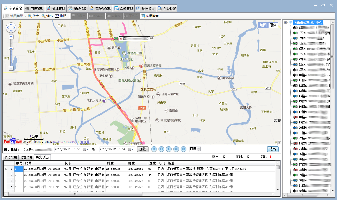 每輛車的行駛記錄隨時在監(jiān)控中心電子地圖上回放,以重現(xiàn)某輛車,在過去3個月內(nèi)某一時段內(nèi)行駛的整個過程,更具體掌握任何時段車輛使用及行駛情況。