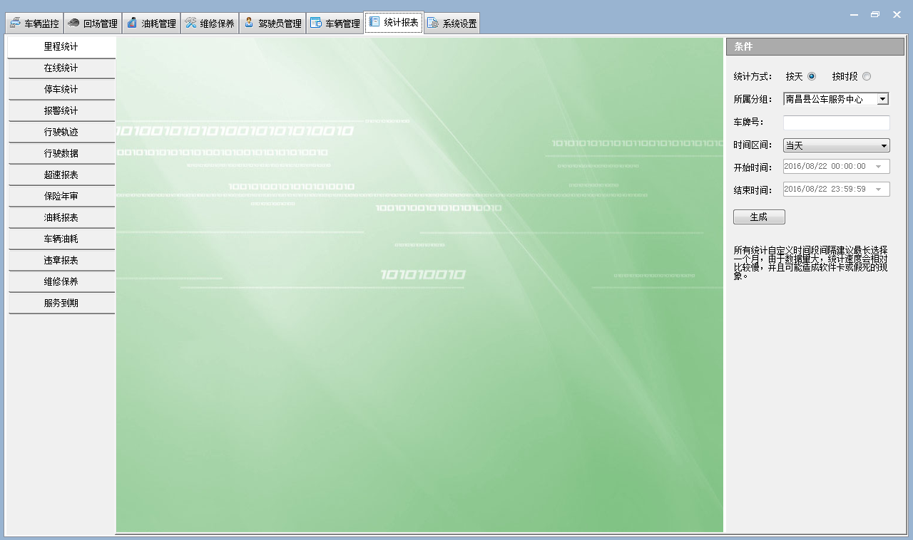 3.4 報表管理:系統(tǒng)可以對車輛的里程,停車,報警,回場,行駛數(shù)據(jù),等等進行統(tǒng)計管理。為車隊隊長的決策提供重要的依據(jù)