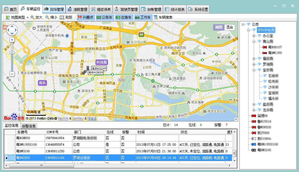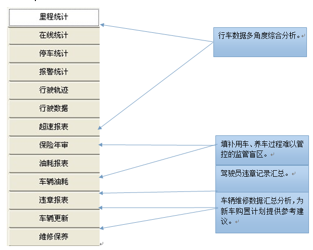 ② 統(tǒng)計(jì)報(bào)表、成本控制模塊:報(bào)警、油耗、里程、維修、保險(xiǎn)等數(shù)據(jù)及時(shí)分類生成報(bào)表。全面管理監(jiān)控,方便成本核算。